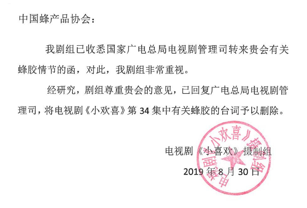 近日,经《小欢喜》制片人与中国蜂产品协会(以下简称中蜂协)蜂胶专业委员会吕泽田主任积极沟通,《小欢喜》摄制组正式回复我会,表示将删除电视剧第34集的有关内容,同时也会将相关处理情况回复广电总局电视剧管理司。